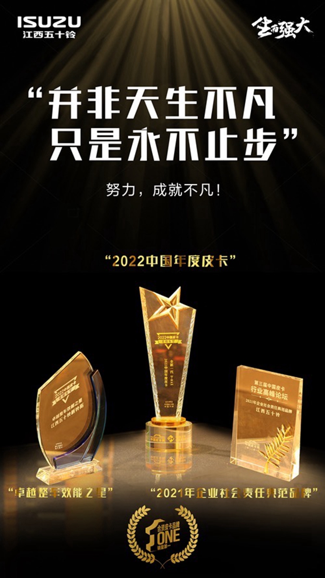 值得一提的是,全新一代D-MAX在拿过国内外众多大奖后,又于前不久荣获由中国皮卡网颁发的“2022中国年度皮卡”,江西五十铃也凭借在社会责任及公益领域的突出贡献,获得“2021年企业社会责任典范品牌”荣誉称号。
