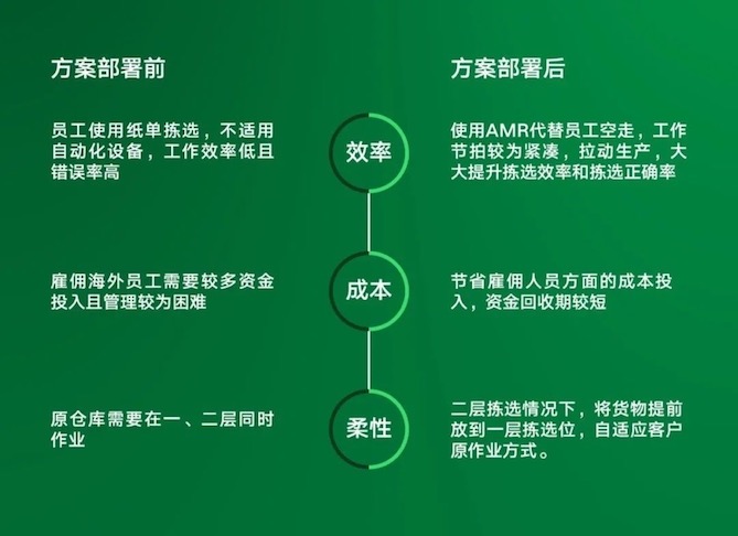 初始投资小,ROI仅2年,使用7台AMR节省拣货、复核人员合计2人,降低人员成本30%;