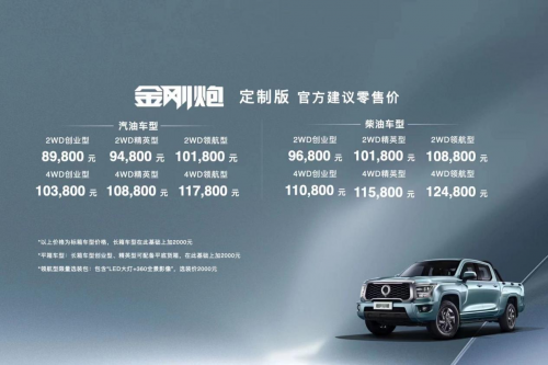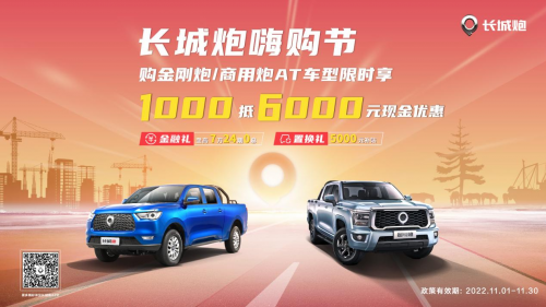长城炮还携手全国经销商,推出现金礼、金融礼、置换礼等终端购车礼。即日起,用户到店购买金刚炮和商用炮AT版车型,可享“1000抵6000元”等超值优惠。