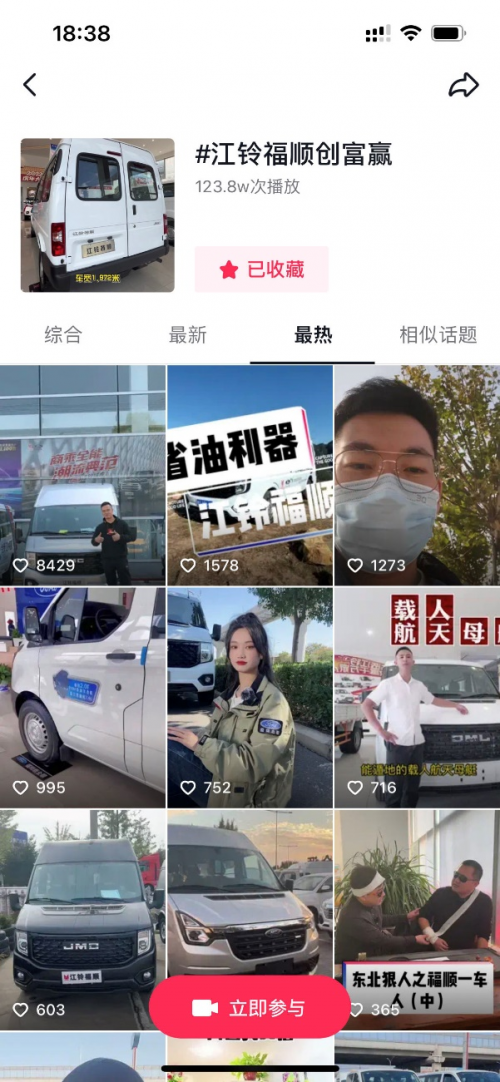 最近,江铃轻客发起了以#江铃福顺创富赢、#福全特顺样样行 为话题的短视频大赛,向全国江铃轻客车主征集温暖、感人、有趣、正能量的“创富”故事。活动一经发起,就引起了江铃轻客车主和经销商们的广泛关注,大家使出浑身解数拍出风格迥异和创意有趣的短视频,力争夺得头筹,赢取至高5000元的拍客大奖。