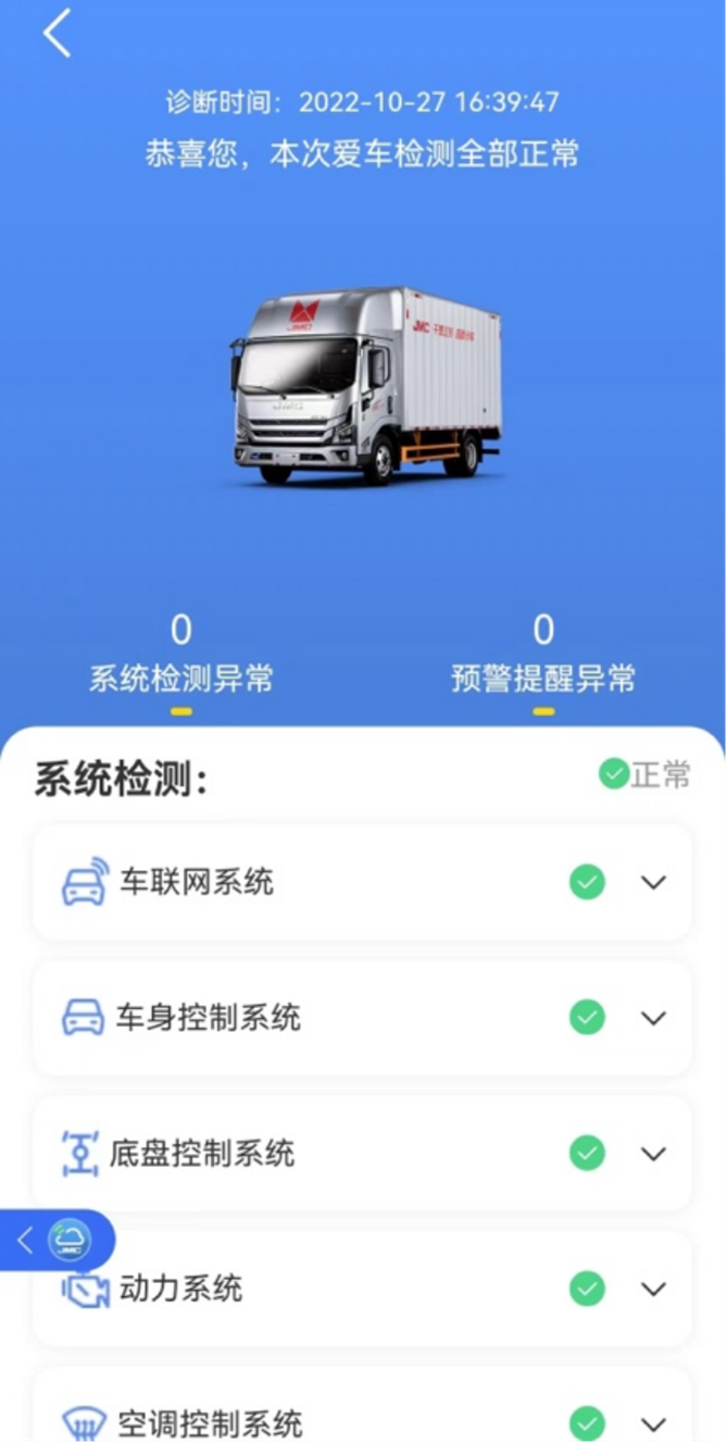 5、车辆体检,支持用户APP端进行车辆9大系统,3大预警项自检。在行车前进行车辆体检,及时发现问题并采取措施,动动手指即可实现。