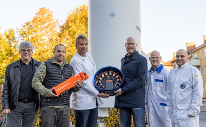 图片说明:在火箭上,有一个Fortis模块(上图中间),它将研究失重状态下13个时钟的状态。此次项目主要参与人(从左到右):Marcel Giger(Fortis运营经理),Andreas Bentele(Fortis市场经理),Stefan Krämer(SSC亚轨道快车项目经理),Jupp Philipp(Fortis所有人及总经理),Oscar Löfgren(SSC机械工程师),Christos Tolis(SSC系统工程师)。(图片来源:What The Film)