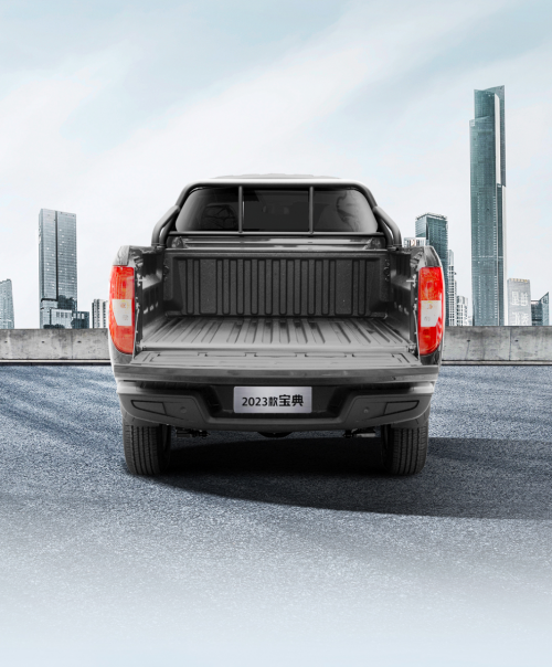 2023款江铃宝典不仅传承了宝典二十年的品质积累,同时在外观设计上也实现了进阶,全新的前脸设计进一步增强了时尚属性,黑色大尺寸进气格栅,配合三横辐装饰和JMC品牌标识,整体更加霸气,保险杠底部的黑色装饰一直延续到两侧大灯下方,外观大气比肩硬派SUV,称得上商用皮卡界的“颜值天花板”,精致的外观更能彰显车主的独特品味。其车身尺寸长达5656mm,宽阔的大平层货箱长宽高达到1820*1475*500mm,装载力超出同类竞品14%,带来1342L的超大载货量,整车承重可达1.2吨,春节期间买再多年货和礼品它都能装载,你只需带着满载的祝福出发。