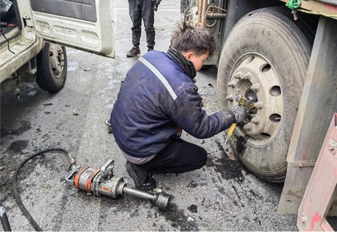 救援团队随即对故障车辆展开全面检查维修,发现方向机正常,经进一步检查,确定是第二桥一颗螺栓断裂。意料之外的故障,现场没有备件,救援团队果断决定,兵分两路,一路人员负责拆卸旧件,另一路人员返回服务站协调新件。下午17时13分,新配件抵达,一同到来的还有热水、食物和柳州特产螺蛳粉,给用户送上温暖。19时53分,新配件安装后,车辆彻底修好,解决了客户的燃眉之急。