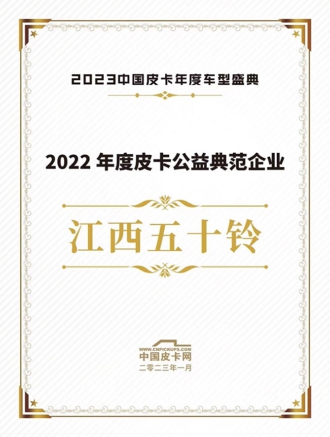 2022年是挑战与机遇并存的一年,面对更为明朗的政策环境和越发严峻的竞争压力,江西五十铃不惧艰难,勇往直前,以匠心造好车,以高品质赢得用户好口碑,持续推动国产皮卡向上发展。凭借在皮卡文化、慈善公益方面做出突出贡献,江西五十铃分别获得2022年度皮卡文化典范品牌、2022年度皮卡公益典范企业,彰显了社会各界对其投身公益慈善事业的肯定,也是对企业传递向善力量的期许。
