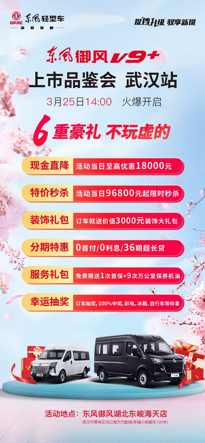 趁以2023年经济复苏市场回暖的东风,东风御风V9+上市品鉴会系列活动适时而来,已经陆续走进南通、南京、宁波等中国重要的经济城市。3月25日,东风御风V9+上市品鉴会即将来到华中经济引擎—湖北武汉。这也是广大车友期盼已久的盛事,东风御风提前为您解锁本次活动上值得期待的四大亮点。