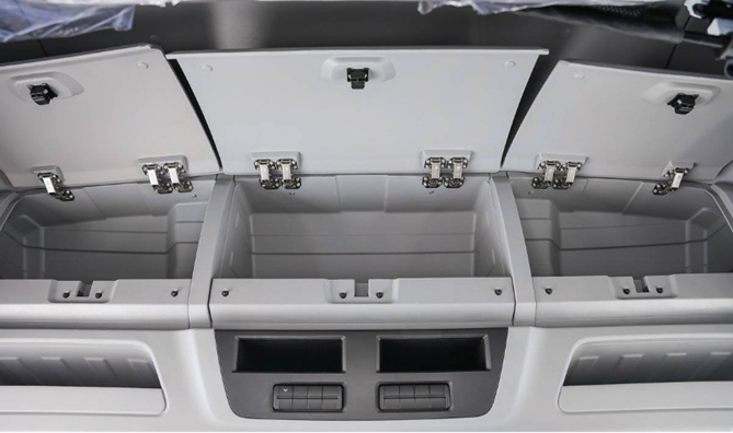 不仅如此,为了广大卡友实现一边赚钱一边生活的梦想,大黄蜂Plus还致力于打造豪华装修、舒适便捷的两室一厅。首先,中控面板的周圈以及副驾侧的装饰条都做了高亮处理,提升了质感。方向盘、座椅多处采用了明黄材料装饰,颜色更加科技时尚。还配置了触感极佳的麂皮装饰,在给予视觉冲击的同时,打造更具品质感的移动之家,整个驾驶室为卡友打造奢华、舒适的驾驶环境;其次,驾驶室生活区进行了细节优化,卧铺区域增加了灯光、车窗控制开关和USB充电口,卡友在卧铺休息时,无需起身就能实现手机充电、车窗关闭,非常方便。驾驶室还配置了220V充电接口和晾衣杆,能够满足卡友出门在外插电饭煲、热水壶以及晾晒衣服等基本生活需求;此外,还设置了丰富的储物空间。中控台上方布置了3个封闭式储物柜以及4个储物格,可以分别存放换洗衣物、洗漱用品、就餐食品等各类物品。可以说,奥铃大黄蜂Plus不只是简单的配置升级,而是营造了一种全方位、人性化的驾乘体验,在细节设计上考虑卡友用车中真实需求,真正为卡友打造移动之家,提升卡友综合幸福感。