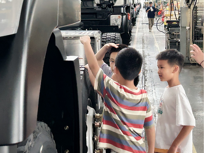 踏入上汽红岩智慧工厂的生产车间,孩子们的惊叹声络绎不绝:“哇!这里有很多机器人耶!”“那个卡车我之前在学校门口看见过!”“咦!这个卡车的轮胎好大,比我还要高!”,看着一辆辆平时难以接触到的重型卡车近在眼前,孩子们难以抑制心中的兴奋与激动之情。