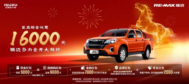 想赚钱,先选对车!RE-MAX 瑞迈专为实干家而生,能扛能跑、皮实耐用,重载依旧稳扎稳打,是创业路上名副其实的“千里马”。开年之际,瑞迈“马力全开”大放价,购车至高可享16000元综合优惠。包括:现金红包至高5000元或增换购红包至高9000元(二选一),再叠加至高价值7000元2年8万免息金融红包。老客户购车还可额外叠加2000元优惠,力度空前,买到即省!