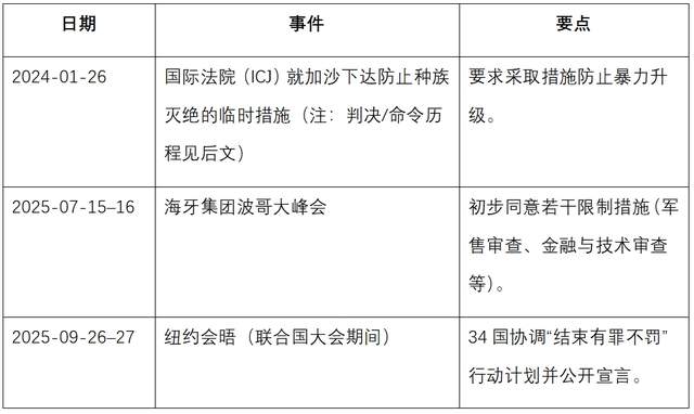 海牙集团自今年年初开始以“阻止加沙种族灭绝/结束有罪不罚”为主题推动跨国协调。7月在哥伦比亚波哥大举行的部长级峰会期间,多国已就若干约束性与非约束性措施达成初步共识;9月纽约会晤将这些方案扩展并宣布有34国参与,形成一套更为明确的“联合行动计划”。