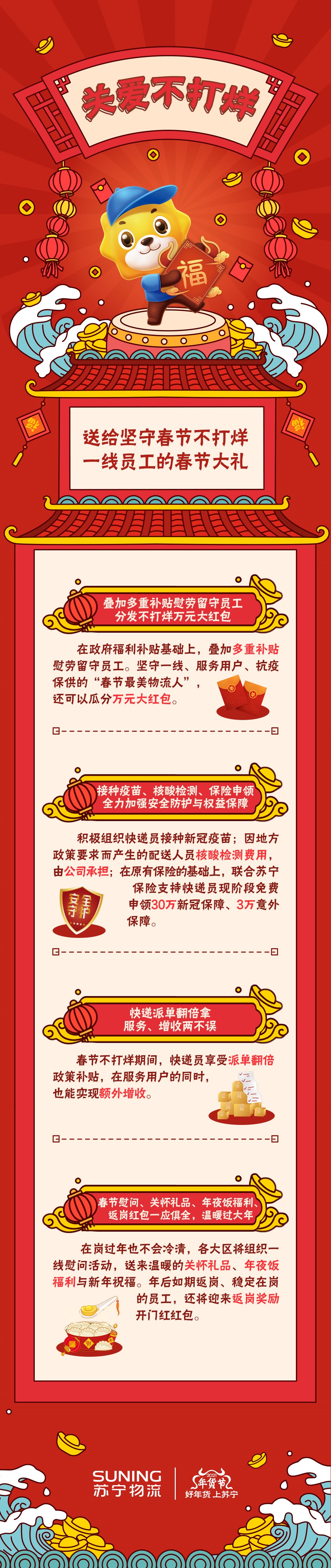 除进行春节慰问、发放关怀礼品与年夜饭福利等一系列关怀活动外,叠加多重补贴用以慰劳留守员工;坚守一线、服务用户、抗疫保供的“春节最美物流人”,还可以瓜分万元红包;针对年后如期返岗、稳定在岗的员工,还将迎来返岗奖励开门红红包。这些暖心行动,让大家在工作岗位上,同样能感受到与家一样的浓浓“年味”。