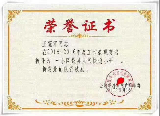 因为广受好评,2017年,华府二期的妈妈们集体给王冠军颁了“小区最具人气快递小哥”奖,表达了对这位像亲人一样的快递员的感激之情。为居民服务5年来,王冠军获评“冠军师傅”、“把平凡工作做到极致”“特靠谱会发光”、“温暖我们的普通人”、“全部好评没有中评”,在居民心中,他是“最棒的快递员”,没有之一。
