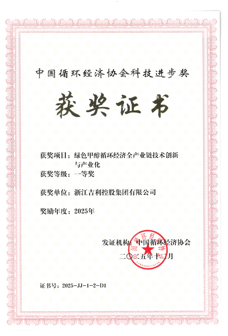 值得一提的是,由吉利控股集团主导的“绿色甲醇循环经济全产业链技术创新与产业化” 项目,于今年3月荣获 “中国循环经济协会科学技术奖”科技进步奖(技术开发类)一等奖,这一权威奖项也标志着吉利在推动能源多元化、构建循环经济产业链方面的探索获得高度认可。