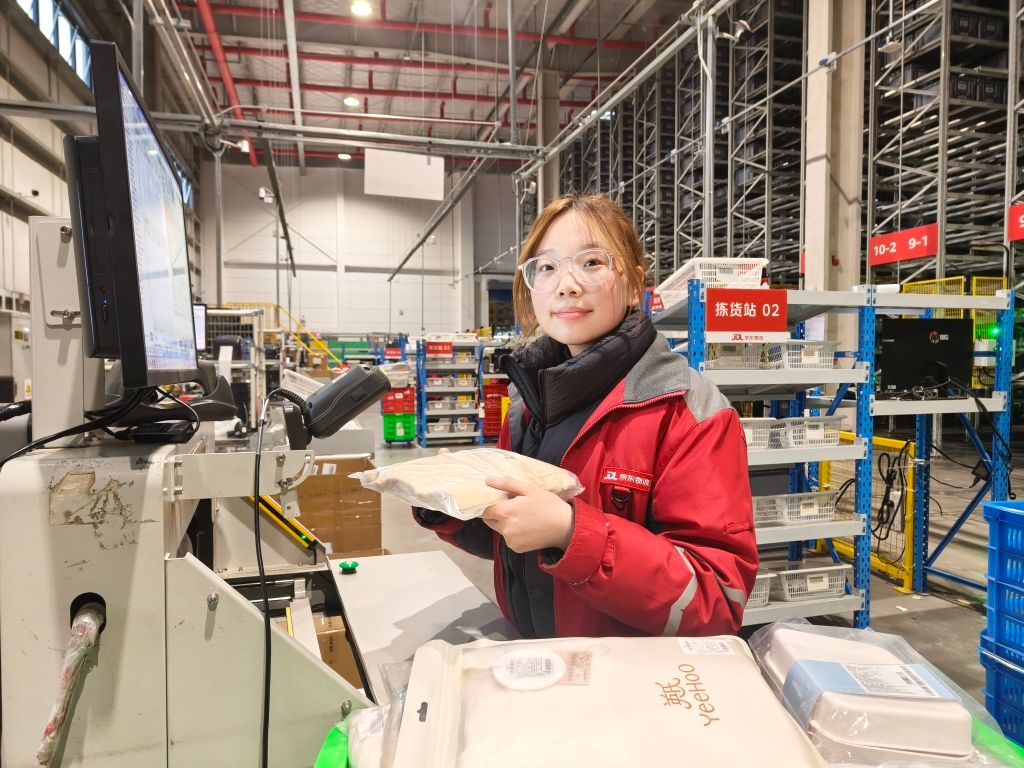 北京大兴机场京东物流北京智能产业园内,2004年出生的陈鑫瑶正专注地站在自动化打包台前。拿货、扫码、装袋、贴码,这套自动化流程行云流水,打包好一个包裹耗时不超过5秒。在她身后四五米处,京东物流智狼货到人系统持续高速运转,她手中的所有货品,均来自这套智能货架的精准输送。